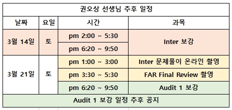* 3월 21일(토) 오후에 진행되는 Inter 문제풀이 및 Final Review는 수업 참석 없이 촬영만 진행되는 점 참고 부탁드립니다.